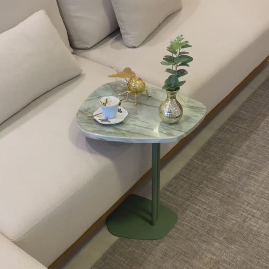 Com medidas de 40cm de comprimento por 35cm de largura, o tampo possui acabamento polido nas bordas de 2cm de espessura, ressaltando o brilho e a elegância da pedra. A sustentação é feita por uma haste dupla em aço carbono com pintura eletrostática, disponível em duas opções de alturas (55cm e 60cm), unindo estabilidade, resistência e design sofisticado.