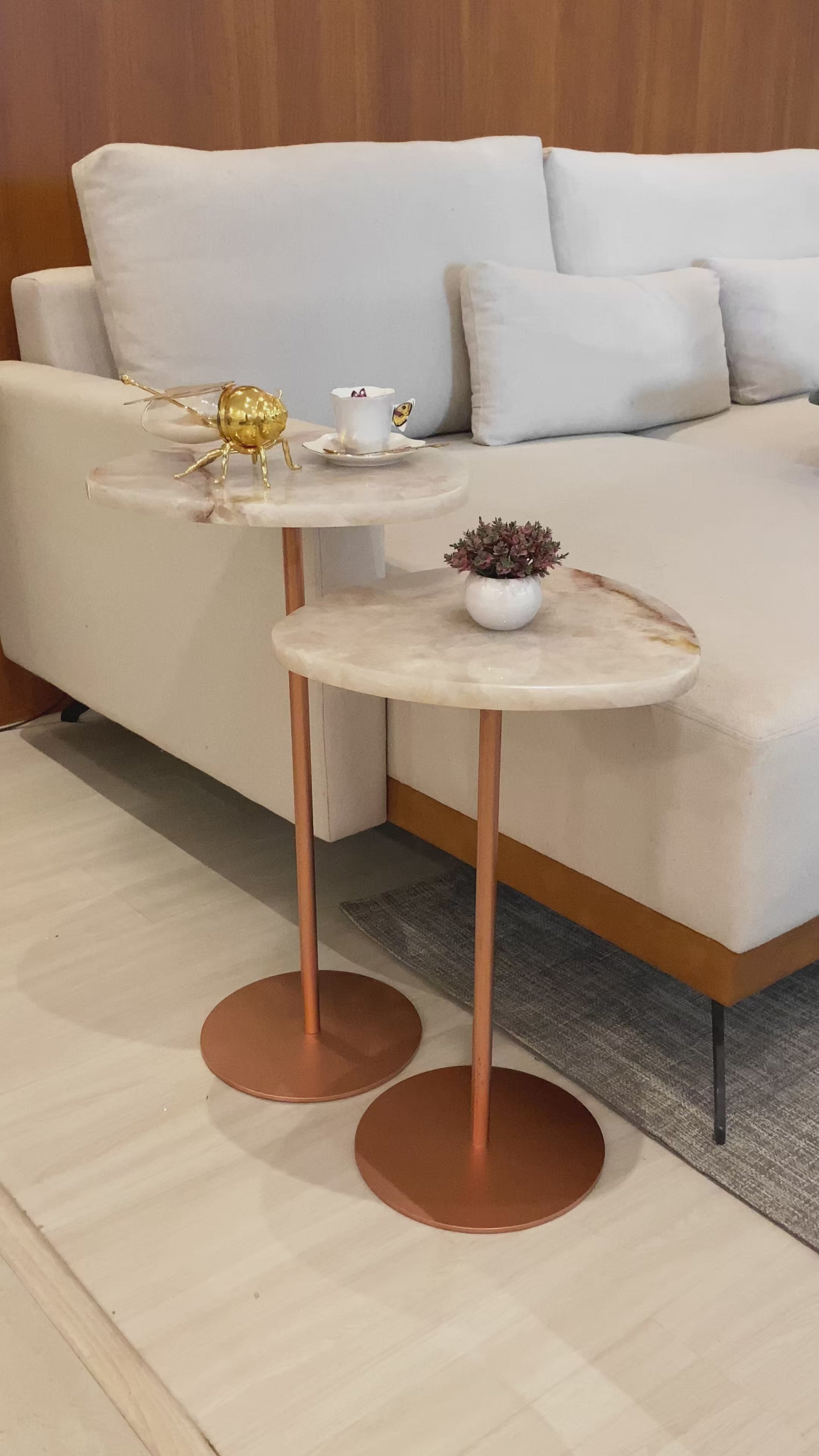 Mesa de apoio Sangiovese Zera com tampo orgânico em pedra natural, destacando veios exclusivos e acabamento refinado. A base metálica minimalista garante estabilidade e leveza visual, criando contraste elegante com o estofado claro do ambiente.