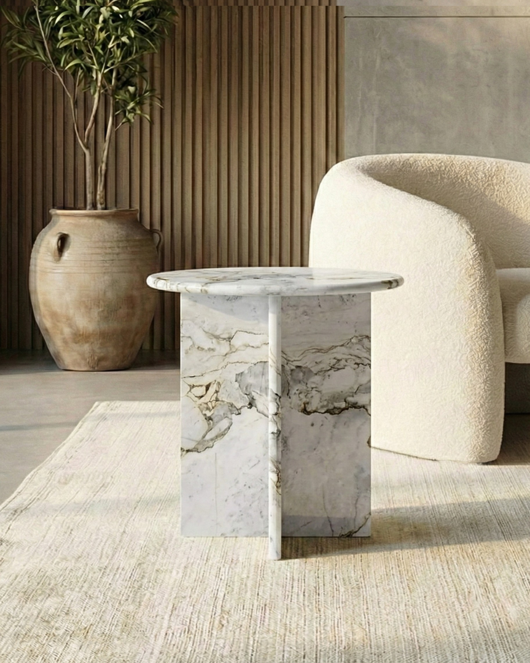 O design aposta em uma arquitetura limpa: um tampo redondo funcional é sustentado por uma base sólida de lajes cruzadas, criando um jogo visual de luz e sombra interessante.