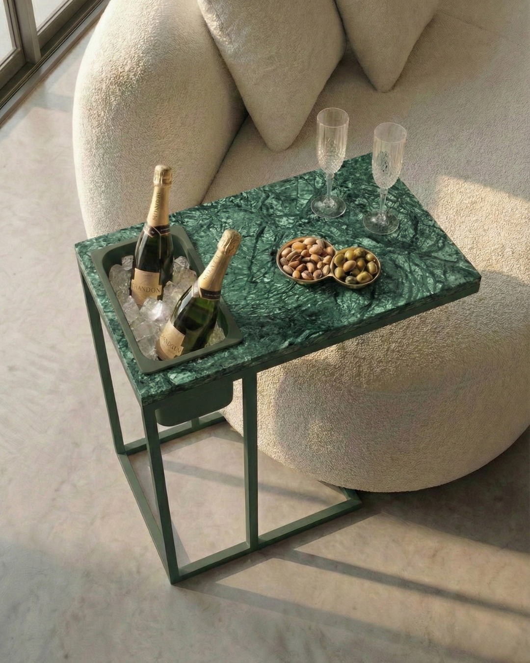 Funcional e sofisticada, a mesa lateral com champanheira em pedra natural é ideal para quem valoriza praticidade sem abrir mão do design.