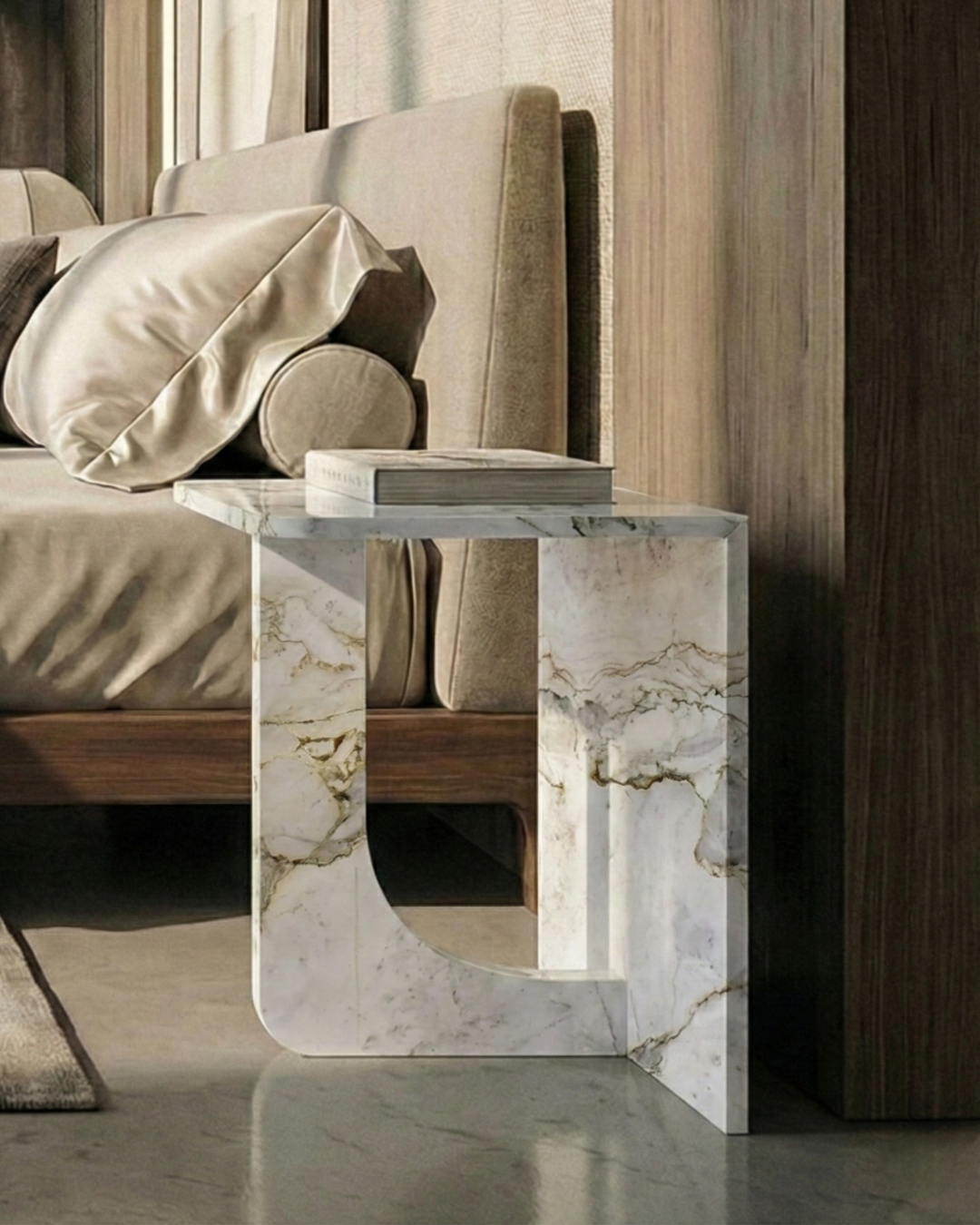 Aparador com tampo em pedra natural. A base em lâmina de madeira natural, de volumetria orgânica, cria um contraste elegante entre a nobreza da pedra e o calor da madeira.