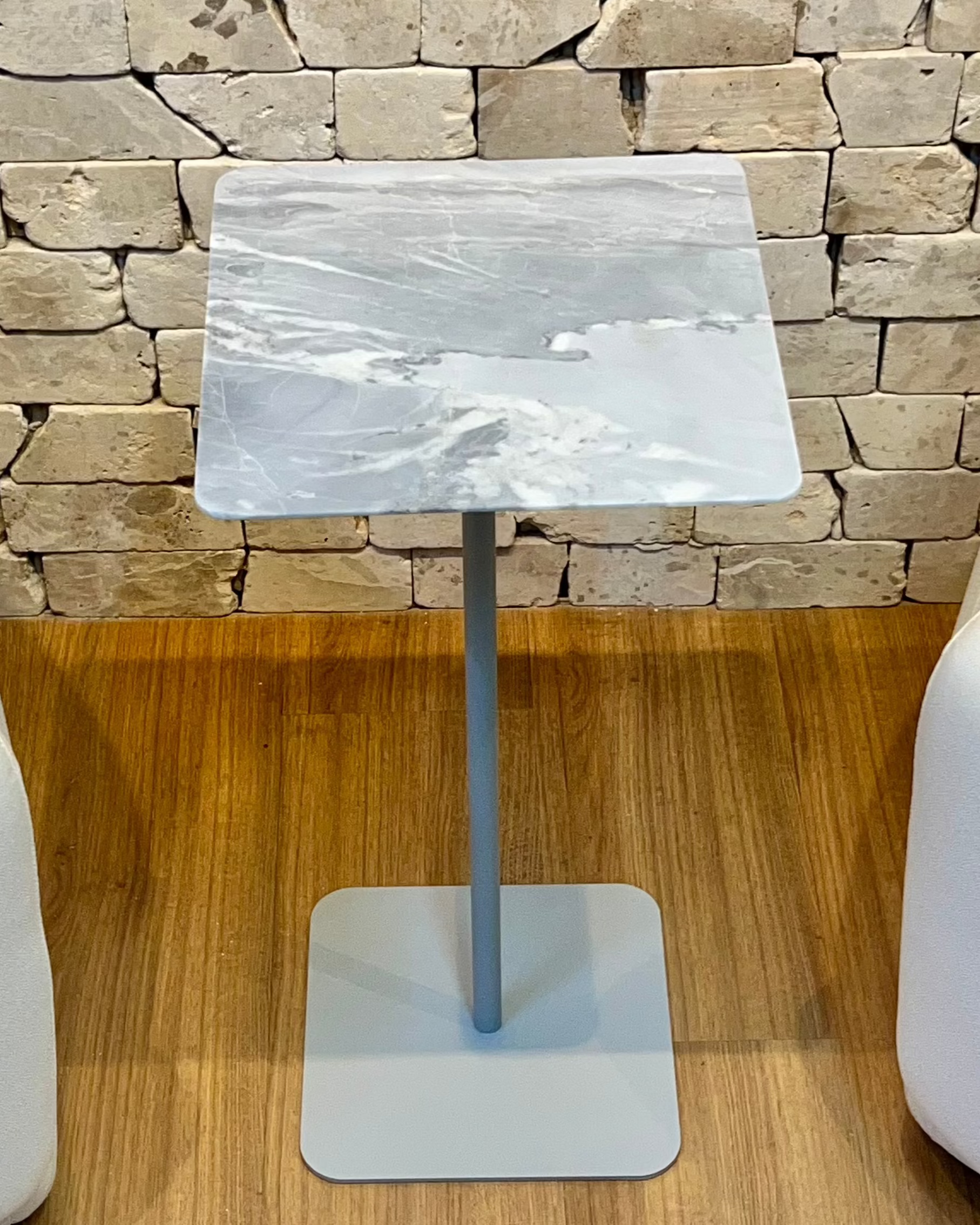 Com medidas de 33cm de comprimento por 33cm de largura, o tampo possui acabamento chanfrado com 2cm de espessura, ressaltando o brilho e a elegância da pedra. A sustentação é feita por uma haste em aço carbono com pintura eletrostática, disponível em duas opções de alturas (55cm e 60cm), unindo estabilidade, resistência e design sofisticado.