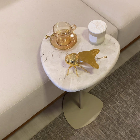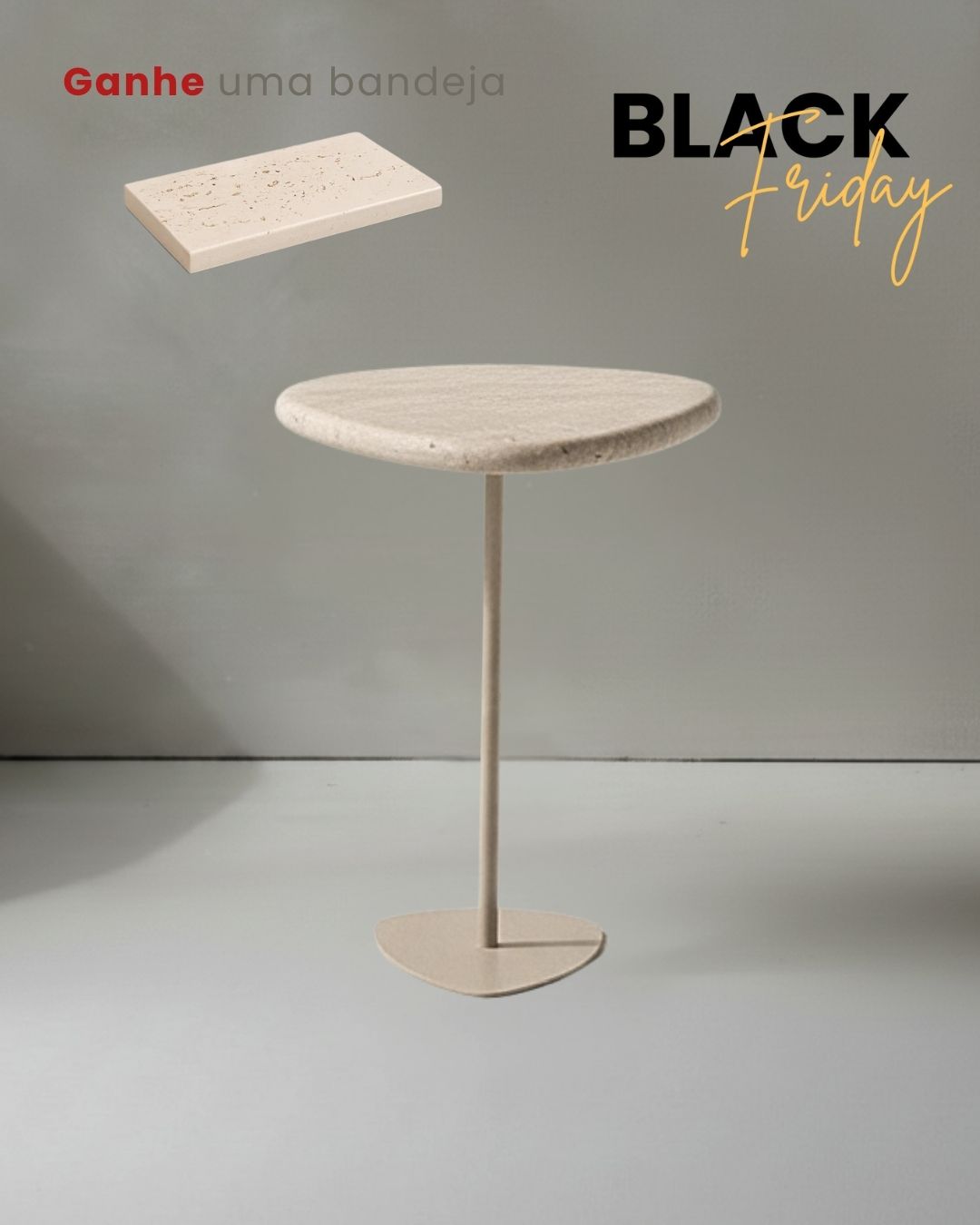 Com medida de 33cm de diâmetro, o tampo possui acabamento boleado nas bordas com 2cm de espessura, ressaltando o brilho e a elegância da pedra. A sustentação é feita por uma haste em aço carbono com pintura eletrostática, disponível em duas opções de alturas (55cm e 60cm), unindo estabilidade, resistência e design sofisticado.
