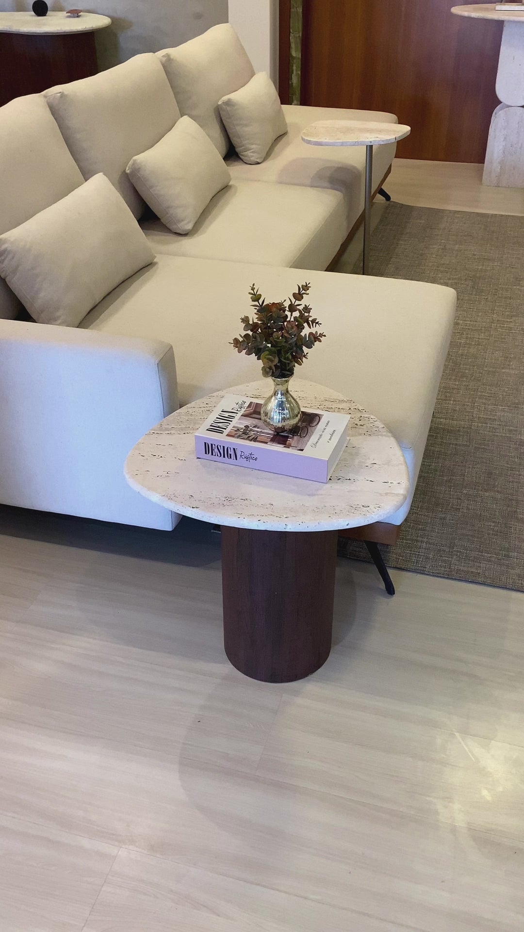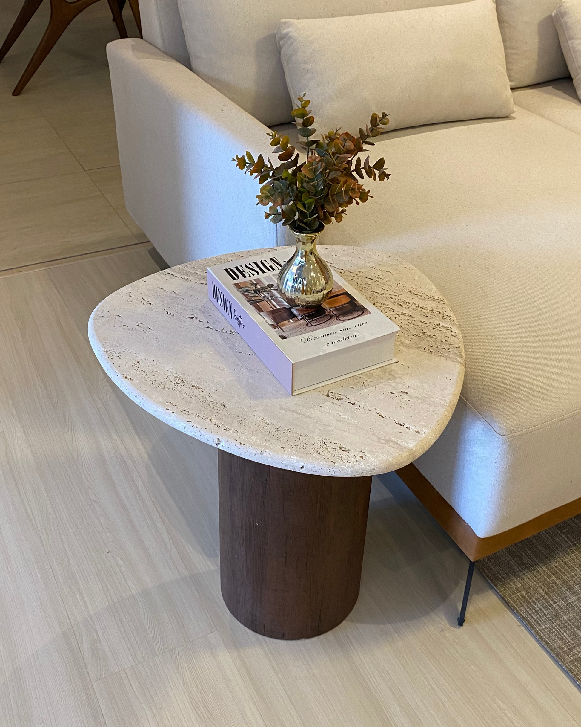 Com medida de 55cm de diâmetro, o tampo possui acabamento boleado nas bordas com 2cm de espessura, ressaltando o brilho e a elegância da pedra. A sustentação é feita por uma base revestida com lâmina de madeira natural, disponível em 45cm de altura, unindo estabilidade, resistência e